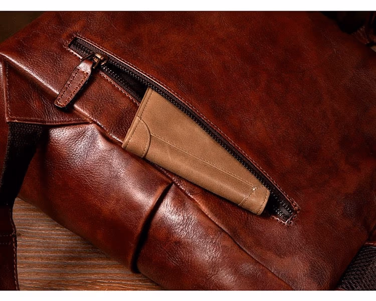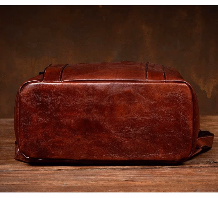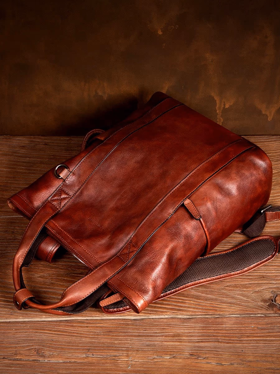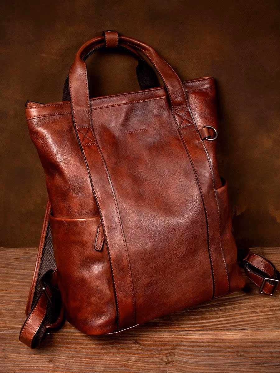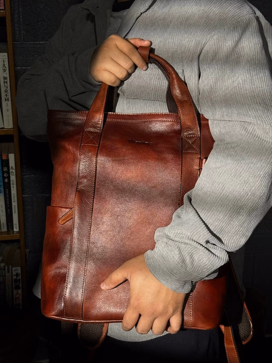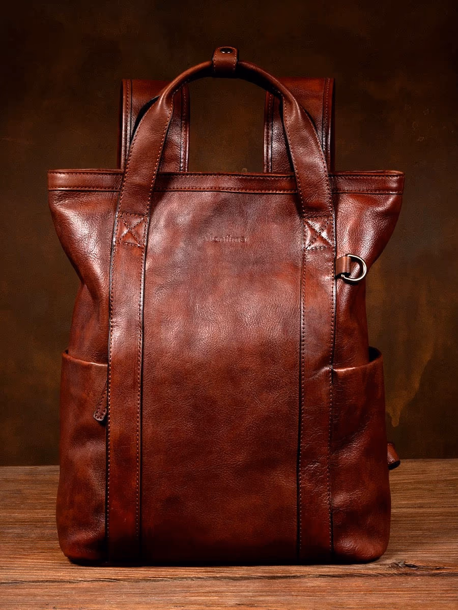 Dual-mode versatility—wear it as a backpack for your commute, carry it as a handbag when you enter the office. Seamlessly transitions from practical to elegantPerfectly sized for daily use—fits up to 16-inch MacBook Pro, essentials, and more. Ideal dimensions for the modern professionalRefined retro aesthetic—exudes sophistication, distinction, and timeless style. This is the most beautiful leather backpack you'll encounterThoughtful design—dual top handles secured with a leather strap and buckle closure, adjustable shoulder straps, external slip pockets, and reinforced D-rings for accessoriesMaterial: Top-grain vegetable-tanned cowhide leatherColor: Rich cognac brownDimensions: 38cm (H) × 32cm (W) × 14cm (D)Capacity: Fits up to 16-inch MacBook Pro, clothes, wallet, and daily essentialsWeight: Approximately 1KGStyle: Convertible backpack/handbagLeather characteristics: Each genuine leather bag is unique. Handmade pieces may show natural variations in color, texture, and feel. Natural marks such as spots, growth lines, and healed scars are preserved to maintain authentic characterZipper: New zippers may be slightly stiff—apply soap or wax to lubricateSmell: The leather smell will fade naturally with ventilation and useColor transfer: During initial use, transparent dyeing may cause slight color transfer when in contact with water or sweat. Avoid wearing light-colored clothing during this periodWater exposure: Do not expose to water or wash. If wet, air-dry naturally in a ventilated area (never use heat). Apply maintenance oil after dryingStorage: When not in use for extended periods, fill moderately with stuffing to prevent deformation. Store in a dry environment to prevent moldFor the professional who refuses to compromise on style. Whether you're commuting to work or stepping into the office, this bag commands respect. It's not just functional—it's a reflection of your refined taste and sophisticated lifestyle.